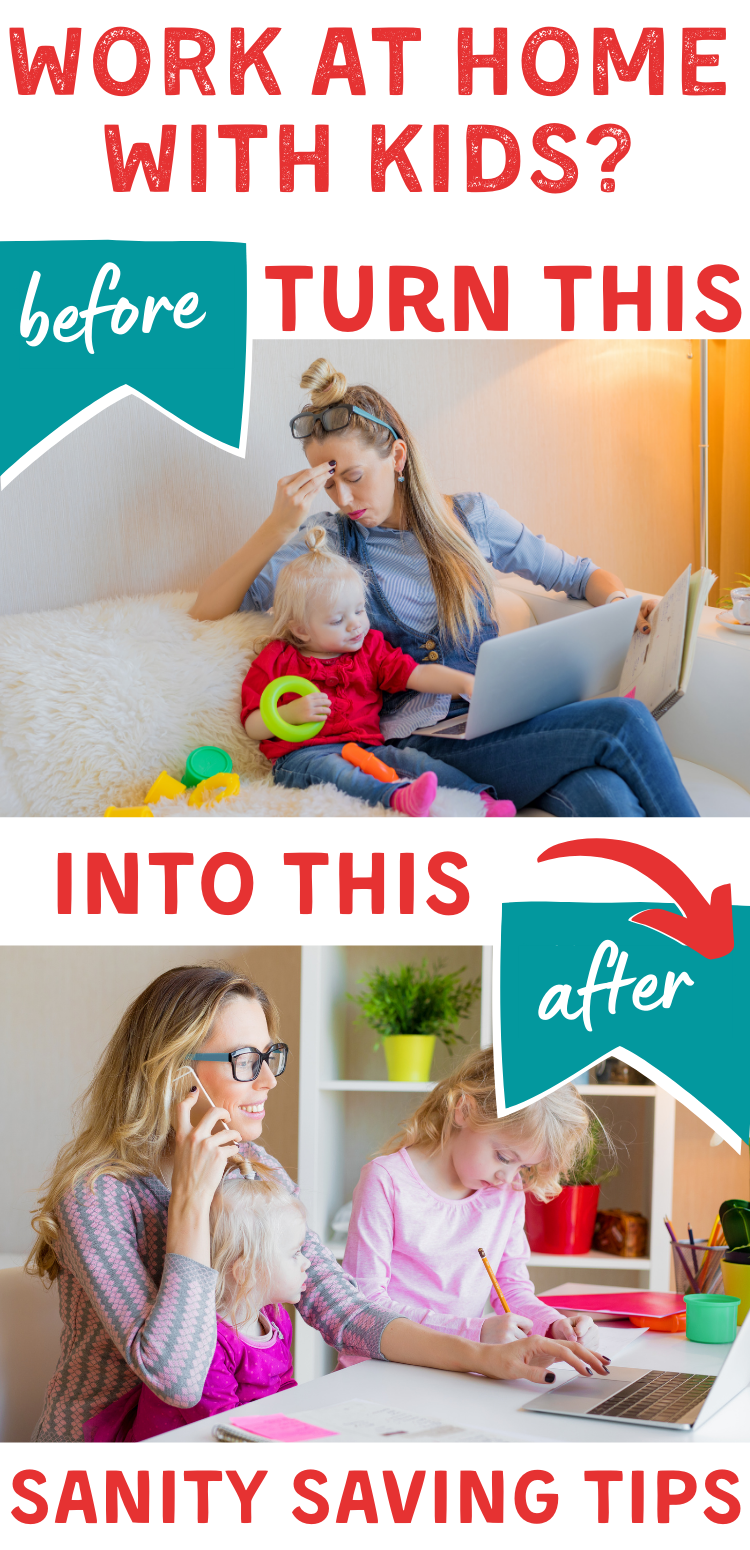 Work at home mom trying to work from home with kids? Try these sanity saving tips from moms to help stay productive and actually get stuff done while working from home with kids. Productivity tips, work from home tips, working mom ideas.